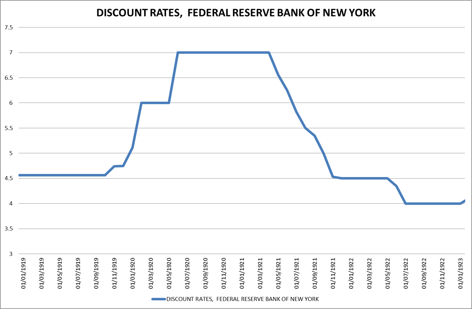 Pero ¿A que se debió la recesión en primer lugar? A la enorme expansión monetaria debido al esfuerzo bélico de USA durante la Primera Guerra Mundial. Ello provocó, ademas de un Boom insostenible que inevitablemente terminó en la recesión que estamos viendo, la inflación más grande del Siglo desde que la Reserva Federal (FED) se inauguró. En noviembre de 1918 la inflación fue de 20.74% con respecto al mismo mes del año anterior, disminuyo por un tiempo y luego comenzó a aumentar a principios del año 20 de nuevo ubicándose en junio de 1920 hasta el record de 23.67%. La FED empezó a aumentar la tasa de interés de descuento en noviembre de 1919 del 4.56 al 4.74, y de ahí la continuo subiendo al 6.00 en febrero hasta un increíble y record 7.00 en junio de 1920[8], manteniéndola así por 11 meses a pesar de la recesión. Es decir que a pesar de lo severo de la depresión (un desempleo medio de 11.70%), el Banco Central mantuvo la tasa de interés a un altura record por casi un año, recién en mayo comenzó a bajarla.