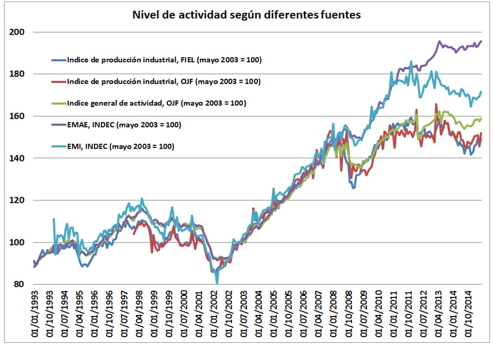 En este gráfico se encuentran diferentes índices desestacionalizados de diferentes fuentes del nivel de actividad. El índice de producción industrial de FIEL y de Orlando J. Ferreres muestran la evolución del nivel de la industria manufacturera. El IGA (Índice General de Actividad) de Ferreres es muy similar a lo que sería el PBI argentino (es un estimador mensual insesgado del mismo). Además están los indicadores del INDEC llamados EMI (Estimador Mensual Industrial) y EMAE (Estimador Mensual de Actividad Económica) que miden mensualmente el desempeño del sector manufacturero y de la actividad conjunta del país (un proxy que adelanta el PBI trimestral) respectivamente según lo que manipula el gobierno. Todos con mayo de 2003 = 100, porque entonces comienza la supuesta "epopeya" de acuerdo el absurdo relato oficial.